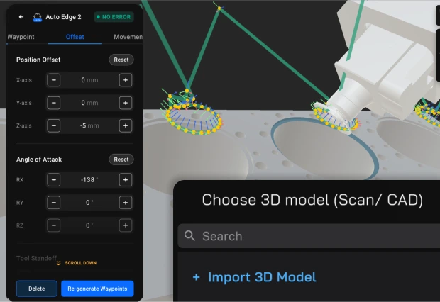 3D scan parts with high accuracy to map complex shapes and contours for precise robot programming. Alternatively, leverage existing designs by importing CAD files of workpieces.